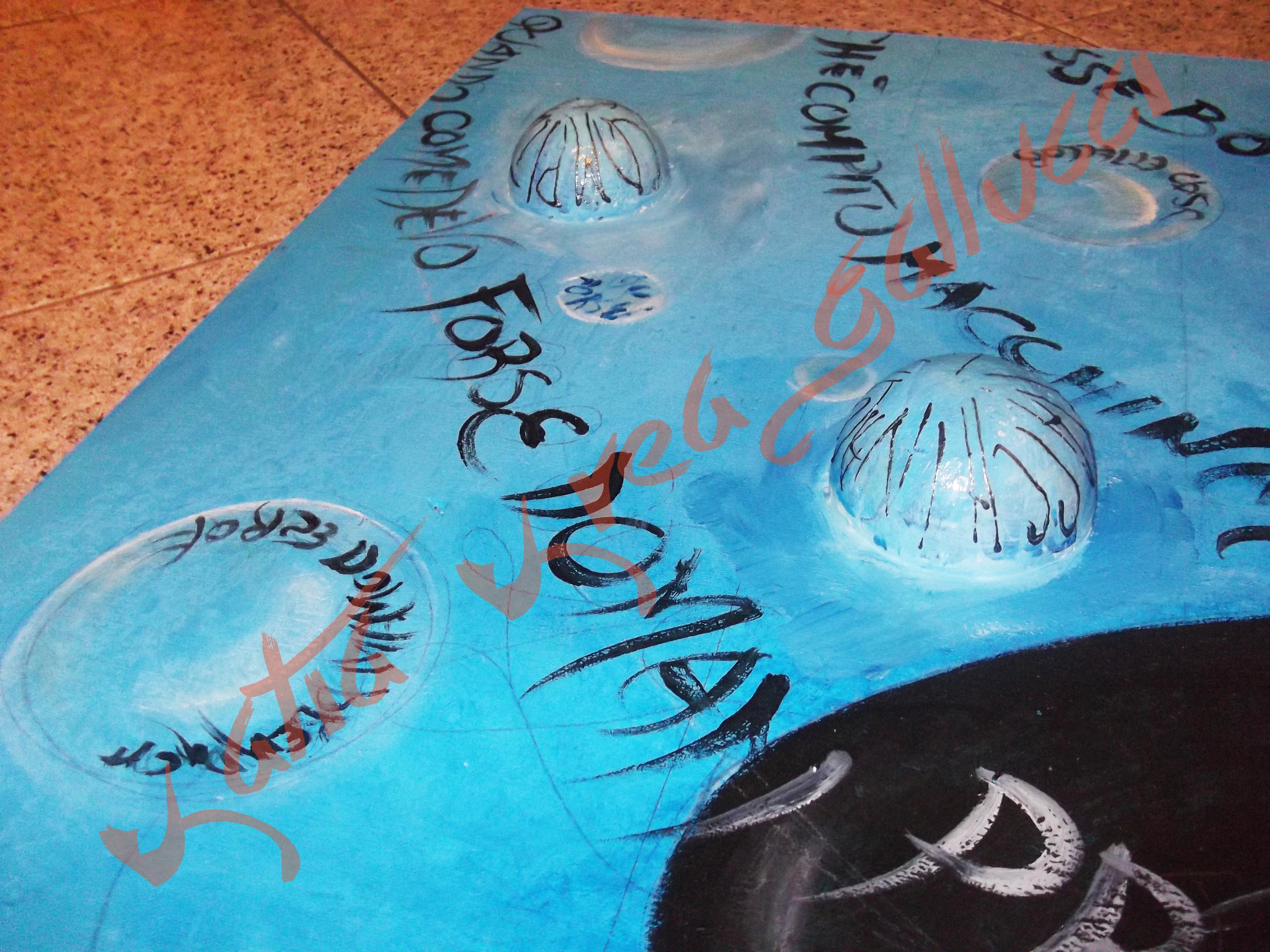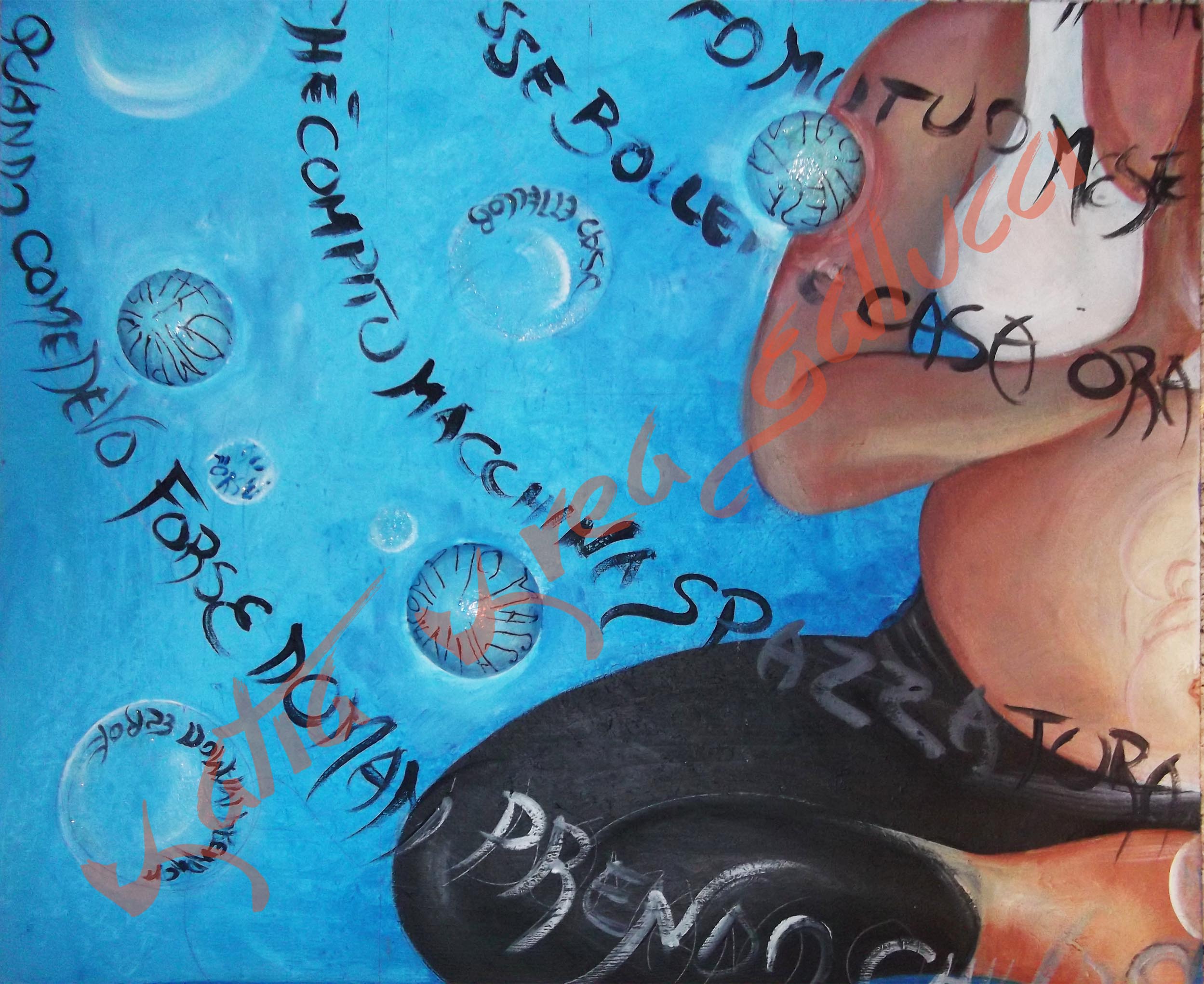 I pensieri sono rappresenti con parole ripetute che accompagnano erroneamente le nostre giornate dominando la capacità di vivere liberamente, alcune parole sono riflesse nelle bolle di sapone (simbolo di illusione) create in 3D per sottolineare l’importanza che spesso si dà all’illusione ed a ciò che sembra esista ma si scioglie come una bolla di sapone….