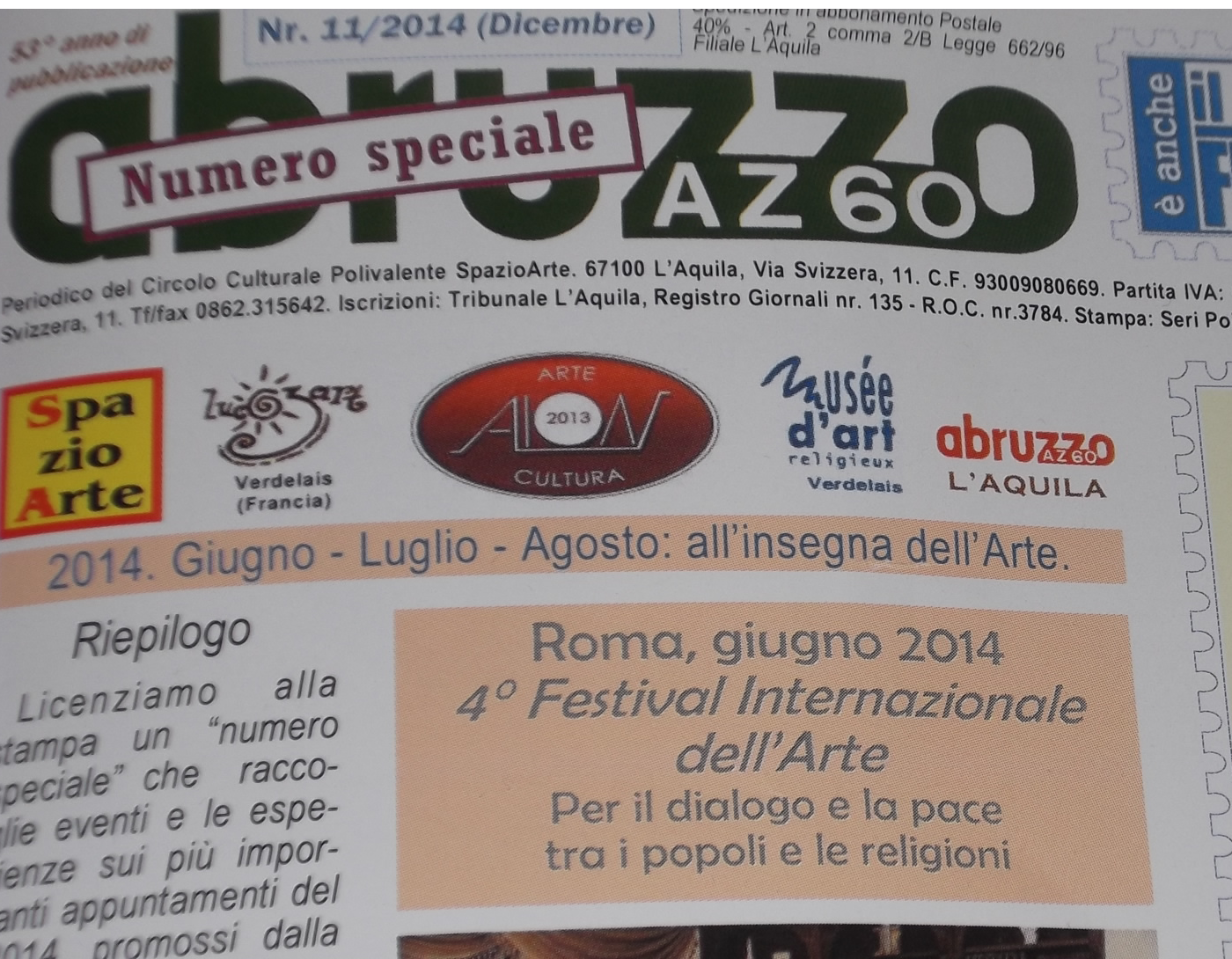 Stamattina mi è arrivato il Numero Speciale del Periodico Abruzzo AZ60, dono del Direttore e Critico d’Arte Emidio Di Carlo. Ho conosciuto Emidio durante le mie ultime mostre d’Arte ed ho potuto scambiare due parole con lui in Firenze a Palazzo Bastogi in occasione di Rosso Fiorentino dove ho esposto la mia ultima opera, il trittico “Krea in Rosso: la Dea”. A differenza di molti Critici d’Arte, Emidio, è una persona semplice e “senza puzza sotto il naso”, parla della sua vita, delle sue esperienze nel mondo artistico senza nessun podio. In un mondo come il nostro è una mosca bianca….Dico grazie a Stefania e Massimo
