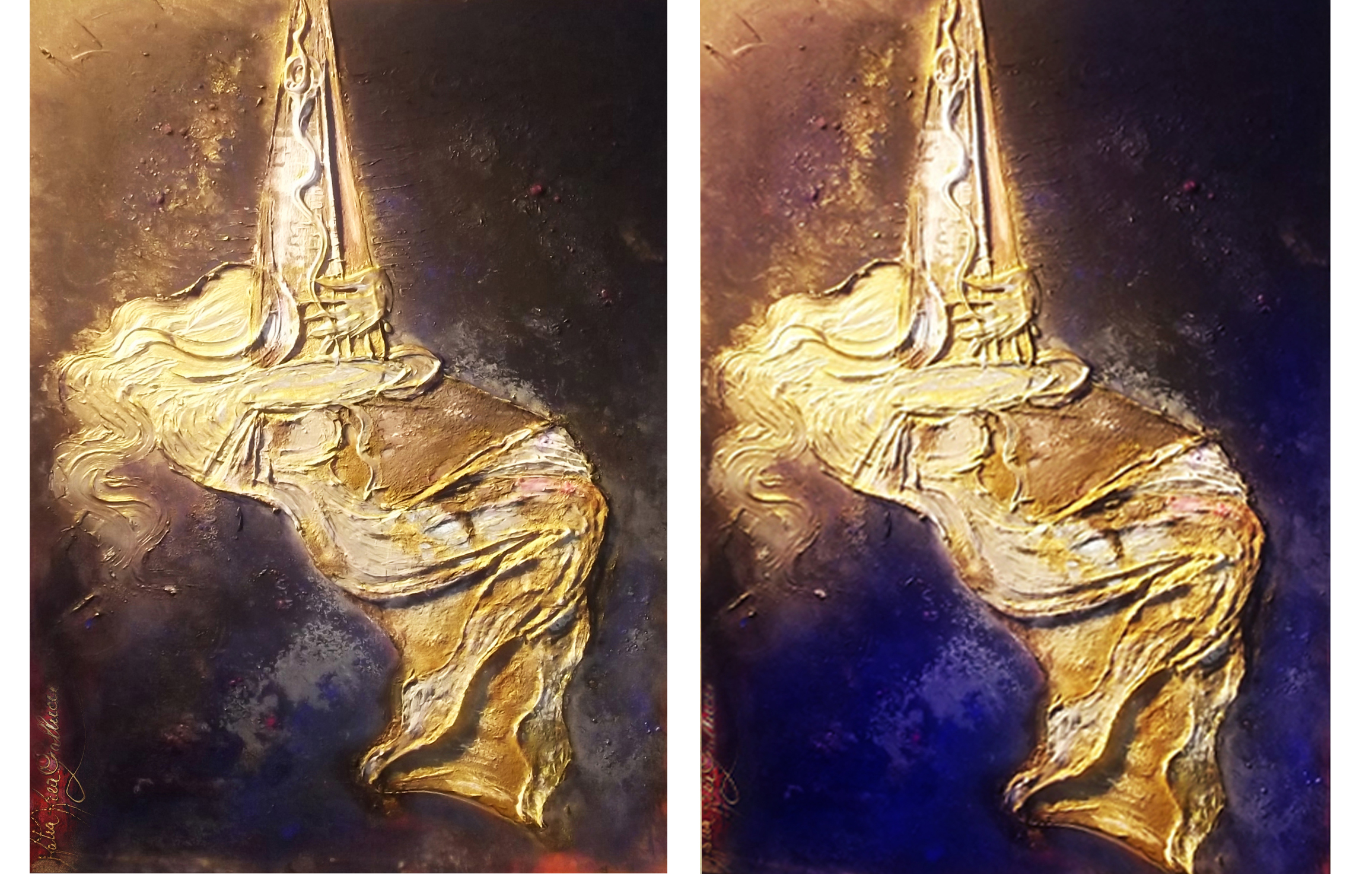 Tutti noi usufruiamo di un libero arbitrio, cioè la capacità di scegliere un’azione tra diverse alternative e quindi, in base a questa affermazione, ho scelto di dare ai colori la possibilità di seguire il loro libero arbitrio ma per fare questo ho “abbandonato” i tubetti ed ho scelto di dipingere con i pigmenti naturali, sia quelli vegetali che minerali….Amo i pigmenti perché ho scoperto che hanno una loro vita che evolve con il tempo, infatti nel “Bozzolo di Vita Divina”, un’opera che ho esposto in varie città e che esporrò alla mostra personale itinerante che avrà luogo in prima data il 10 luglio 2015 con vernissage sabato 11 luglio 2015 ore 16,00 al Villaggio della SalutePiù in Monterenzio (BO), è avvenuto in modo evidente. Avevo dipinto uno sfondo nero con qualche pagliuzza dorata miscelata con un blu molto scuro e dopo qualche mese i miracolosi pigmenti mi hanno regalato uno sfondo blu cobalto lasciandomi a bocca aperta. I pigmenti decidono come muoversi e come incontrare un colore piuttosto che un altro, per me è un miracolo che rende libero il loro viaggio sulle mie tele e mentre si incontrano formano figure che sono una gradita sorpresa che non prevedo mai. L’Arte è Magia…grazie*