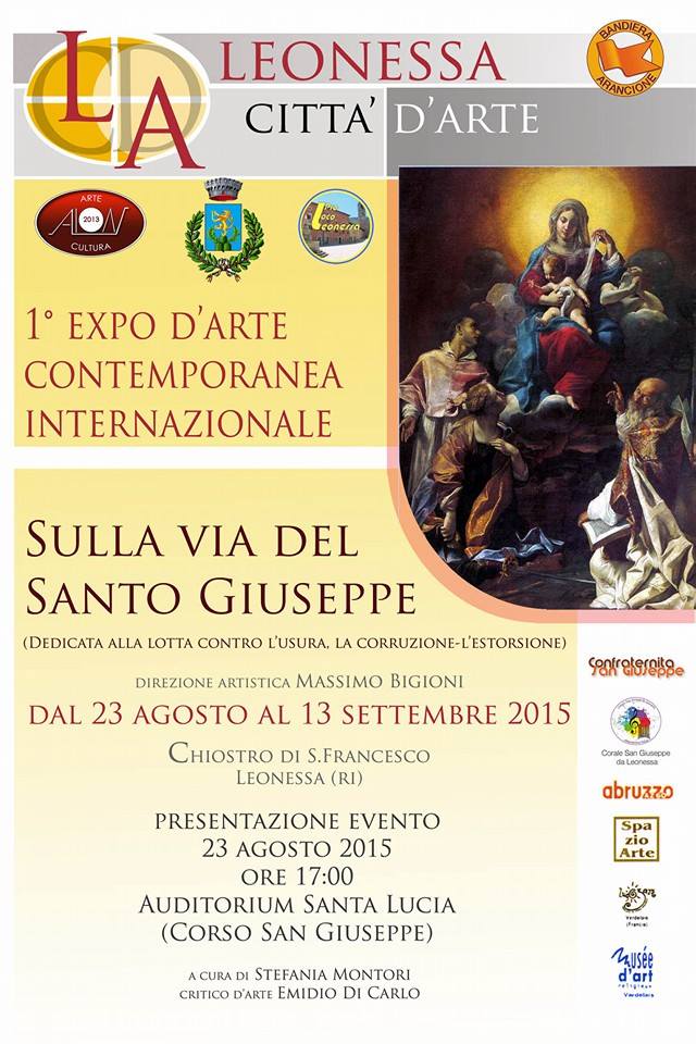 Bellissima iniziativa dell’artista Massimo Bigioni che dal 23 Agosto al 13 Settembre 2015 ha coinvolto la sottoscritta ed altri artisti per la 1° Expo d’Arte Contemporanea Internazionale dedicata al Santo Giuseppe contro l’Usura, la Corruzione e l’Estorsione presso il comune di Leonessa – Rieti. Pur essendo impegnata nel proseguimento della mia personale itinerante “Vivere dentro – il Colore della Libertà”, ho accolto con piacere questo invito volto a pubblicizzare non l’ arte di Massimo Bigioni ma a pubblicizzare la concretezza creativa tramite la fede di un credo abbracciato al cuore del cuore dei colori di ogni artista che ha accolto questo invito. Grazie Massimo ma anche grazie a chi ti aiuta sempre nella organizzazione, Stefania Montori. Questo è un video del comune di Leonessa che dedico al grande Massimo e la locandina di questo evento. Grazie….a presto